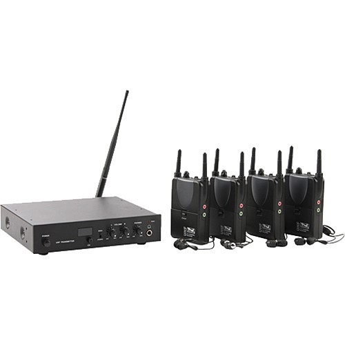 En este paquete se incluyen cuatro receptores de paquete de cinturón alimentados por batería, cuatro auriculares intrauditivos, una estación base de transmisor inalámbrico y un maletín de transporte. La estación base opera dentro de un rango de frecuencia de 540 a 570 MHz, y cada paquete de correa con batería cuenta con 16 canales seleccionables por el usuario con soporte para un número ilimitado de usuarios y un rango operativo de hasta 200 'línea de vista . La unidad cumple con ADA e incluye un kit de montaje en rack.